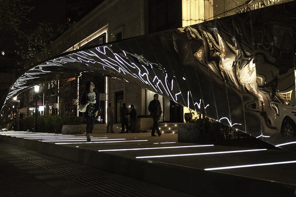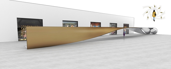 這個(gè)30米長(zhǎng)的公共裝置是一整塊造型扭曲反轉(zhuǎn)的板,墻會(huì)自然過(guò)渡為天花,路過(guò)行人的身影會(huì)被反射。Ben van Berkel說(shuō)他們希望將這個(gè)裝置做成裝扮公共空間的一個(gè)焦點(diǎn),能夠吸引周圍的公共,人們路過(guò)這里就像是在走秀,在這里看自己也看別人,看與被看發(fā)生嶄新的關(guān)系,并產(chǎn)生一種全新的理解周圍觀點(diǎn)的方式。